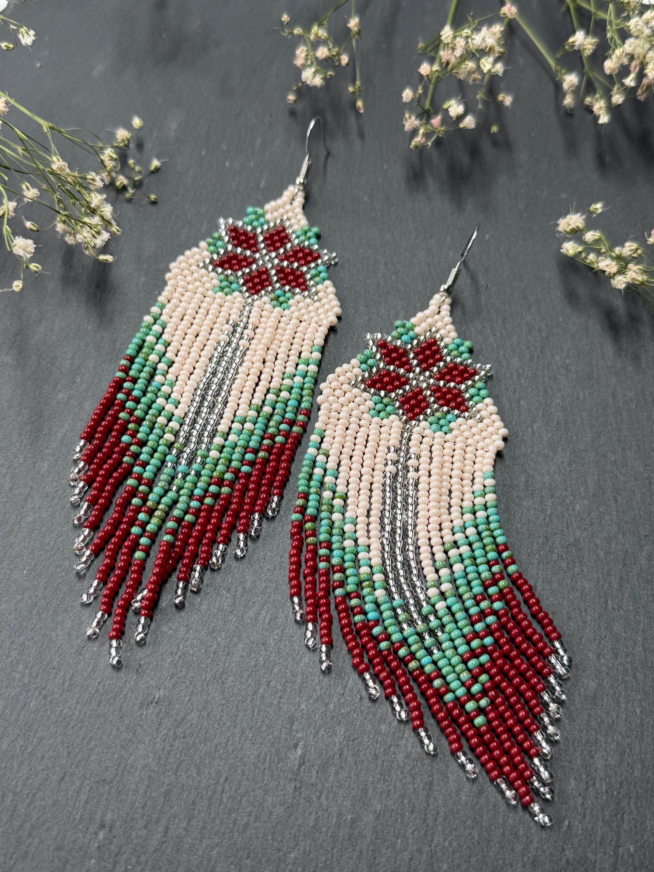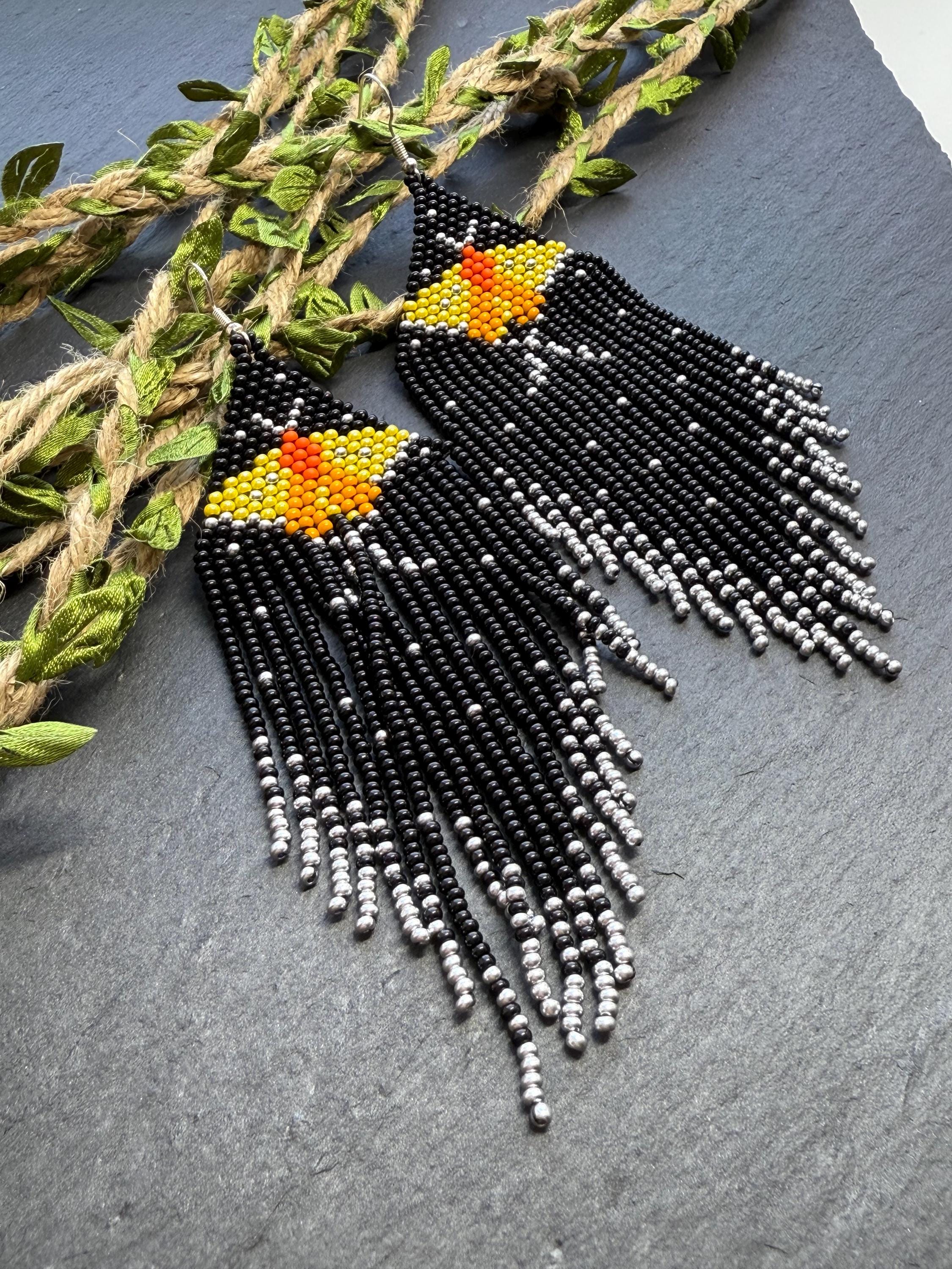 Bright beaded earrings in an native American style with fringe.